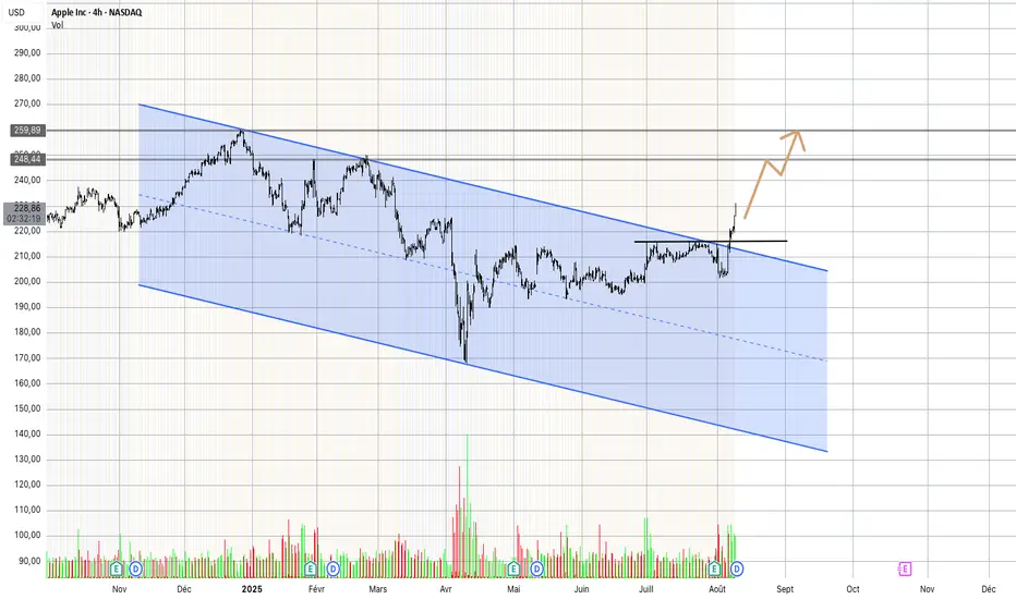 L’action Apple (AAPL) vient de sortir avec force de son couloir baissier, envoyant un signal clair de retournement haussier. 📈🔥 Cette rupture technique majeure redonne de l’élan aux acheteurs et ouvre la voie vers les sommets précédents.