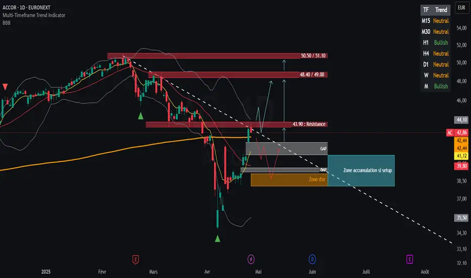 1️⃣ Cassure + clôture au-dessus de 43.90 ➔ Achat.