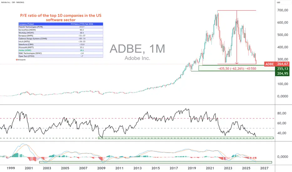 • Le Price Earnings Ratio (P/E) d’Adobe est tombé autour de 16, soit l’un des niveaux les plus bas parmi les grandes capitalisations du logiciel américain