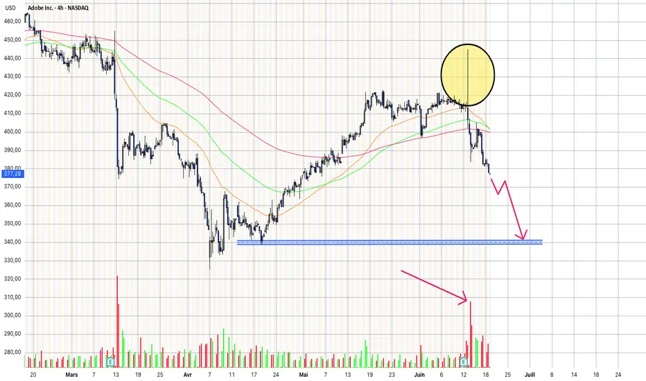 L’action ADBE a récemment affiché un signal technique agressif. On observe un squeeze des acheteurs accompagné d’une mèche longue et d’un volume exceptionnel, indiquant une pression intense qui a précipité la cassure simultanée des moyennes mobiles 200, 100 et 50.