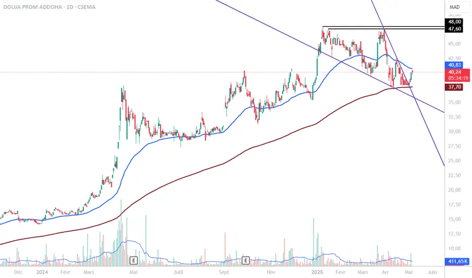 Le graphique d’Addoha indique une tentative de retournement haussier après une longue correction. Le rebond sur la MM200 est encourageant, mais un franchissement durable de la MM50 et des 42 MAD serait nécessaire pour confirmer ce retournement.