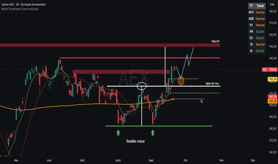 👉 En cas de repli dans la zone (ellipse orange), si un setup d’achat se présente, il sera alors possible d’envisager une entrée pour viser l’objectif (selon moi).