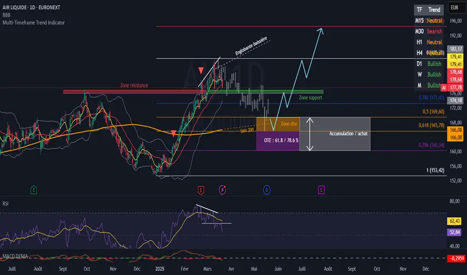 En conclusion, malgré des signes techniques baissiers à court terme, la solidité fondamentale d'Air Liquide et son positionnement dans des secteurs d'avenir comme l'hydrogène pourraient justifier une stratégie d'achat sur repli, en respectant scrupuleusement des niveaux prédéfinis par vos soins.