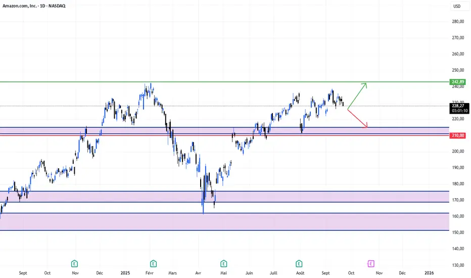 Amazon (AMZN) – Les acheteurs tiennent la zone clé avant la saison des fêtesLe titre Amazon évolue actuellement entre 216 $ et 224 $, au cœur d’une phase de consolidation maîtrisée.