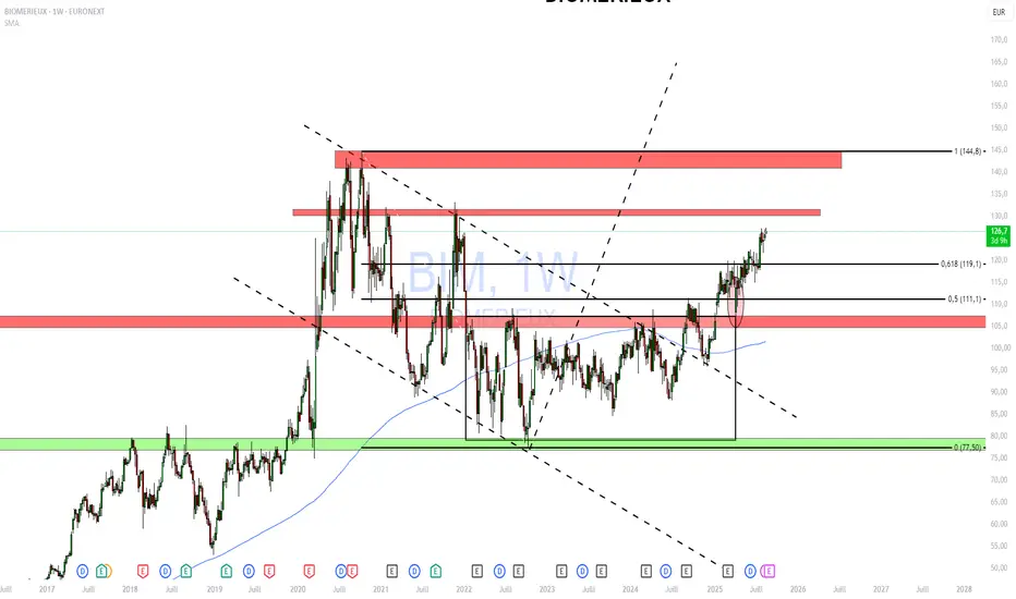 Après plusieurs années d’hésitation sous un large range, Biomérieux confirme une reprise de tendance haussière. La cassure de la zone des 111 € (50 % de retracement de Fibonacci) puis du seuil des 119 € (61,8 %) a ouvert la voie à un retour sur des niveaux plus élevés.