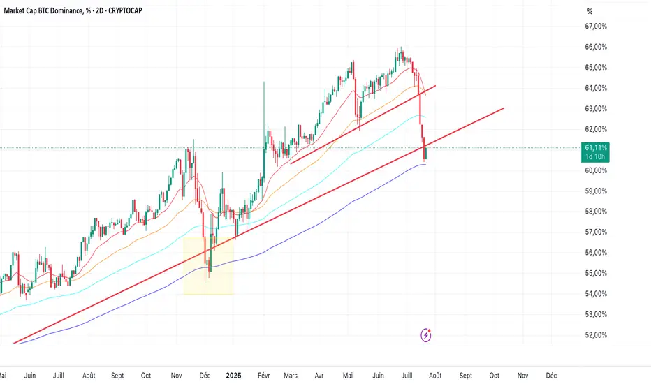 Après une cassure nette de la trendline haussière et un plongeon sous les moyennes clés, la dominance BTC tente un rebond technique sur sa trendline inférieure long terme et la EMA200.