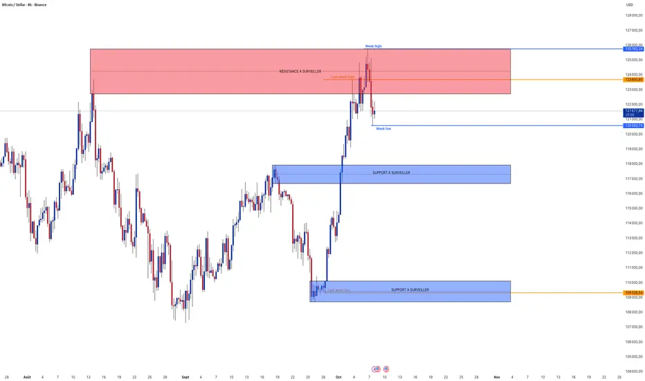 Analyse technique : BTC bloque dans la grosse résistance 123,8–126k : une relance au-dessus du week high (~126k) validerait une extension vers 128–130k, tandis qu’un rejet sous 123,8k exposerait un repli vers le support 118k puis 109,3k (last week low).
