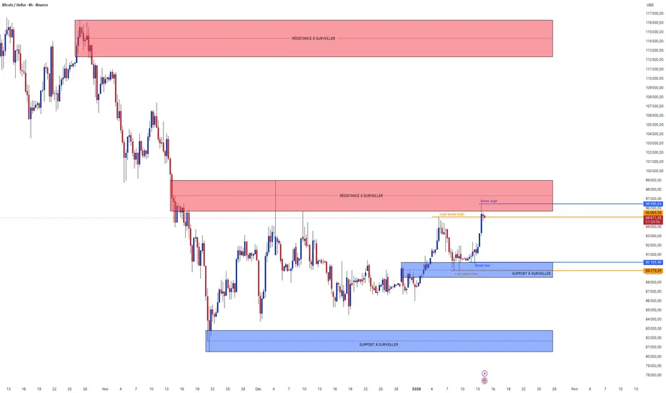 Analyse technique : Le BTC/USD subit un rejet net sous la résistance des 96,500, ouvrant la voie à une correction technique vers le support immédiat des 94,000. Une clôture H8 confirmée au-dessus de 97,000 invaliderait ce signal vendeur pour relancer la dynamique vers les sommets historiques.