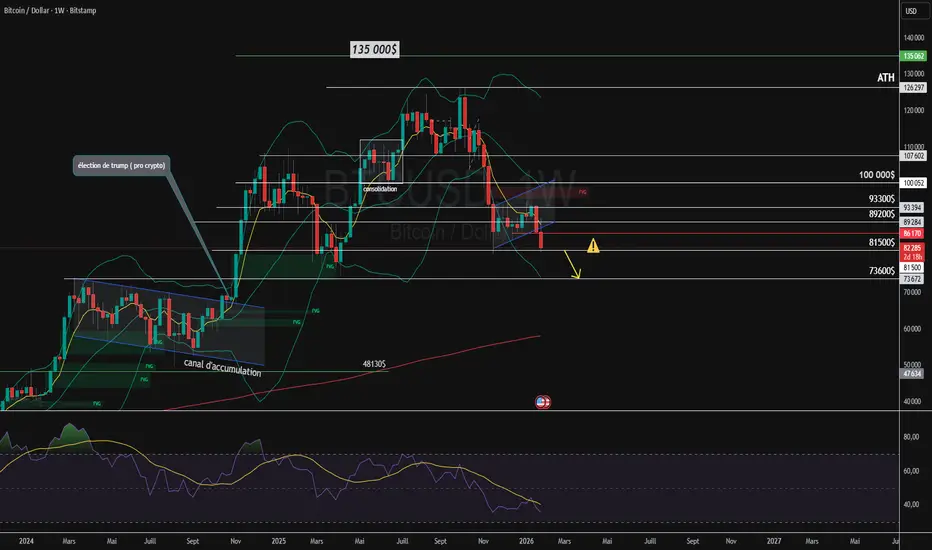 Le canal "bleu" a été cassé à la baisse , la zone des 81 500$/80 000$ reste le dernier support avant un décrochage pour rejoindre le bas du GAP de la semaine du 4 novembre 2024 "élection TRUMP" zone des 73600$ .