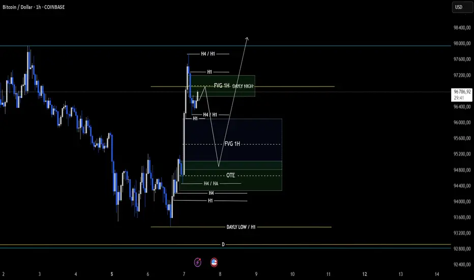 La fin de notre retracement pourrait se faire, dans notre zone OTE + FVG bullish qui jouerait le rôle de support. On viendrait donc chercher nos liquidité basse pour venir chercher nos plus haut car nous retrouvons un biais daily haussier. Ceci n'est qu'une supposition et non un conseil en investissement..