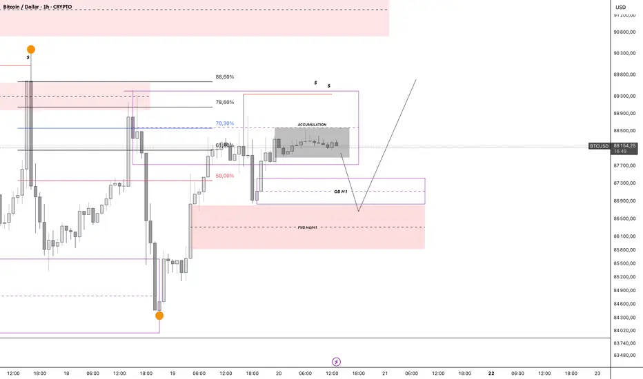 Je m'attends à une manipulation baissière jusqu'au 87 200 - 87 100$, qui correspond à l'Order Block H1 et qui est aussi dans ma zone discount de ma structure (entre les 2 points orange).