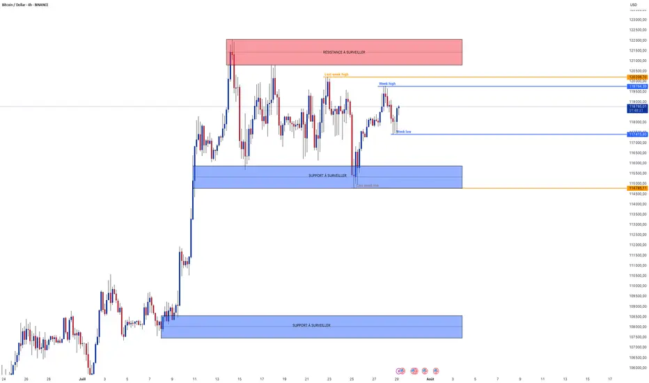 Analyse technique : Le Bitcoin évolue dans un range entre 119 700\$ et 115 000\$, et tant qu’il ne casse pas clairement la résistance hebdomadaire des 120 000\$, les vendeurs peuvent encore reprendre la main pour viser le support des 114 700\$, tandis qu’un breakout haussier ouvrirait la voie vers la zone de résistance majeure des 121 500\$–122 500\$.