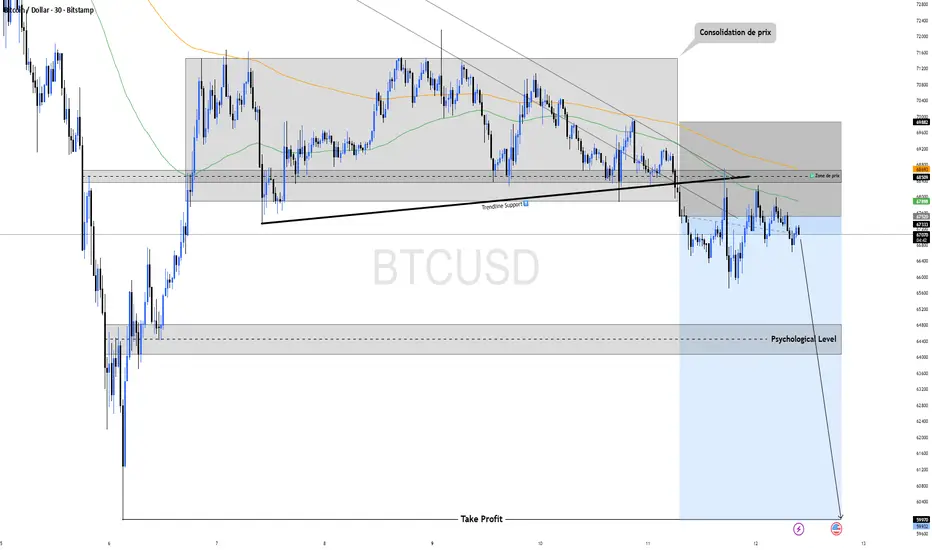 On regarde le Bitcoin aujourd'hui en 30 minutes. Après le rallye qu'on a connu, la structure est en train de sérieusement s'effriter. Je prépare une position vendeuse car les signaux fondamentaux et techniques s'alignent pour une correction plus profonde. Voici mon raisonnement.