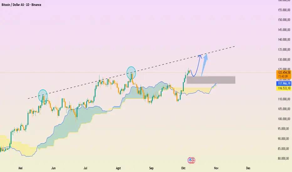 Pada grafik, BTCUSD tetap stabil di atas area support 121.400. Struktur teknikal menunjukkan tren kenaikan masih terjaga, dengan target berikutnya mengarah ke area 132.400. Jika terjadi koreksi jangka pendek, level 121.400 kemungkinan besar akan menjadi titik pantul penting sebelum harga melanjutkan kenaikan.