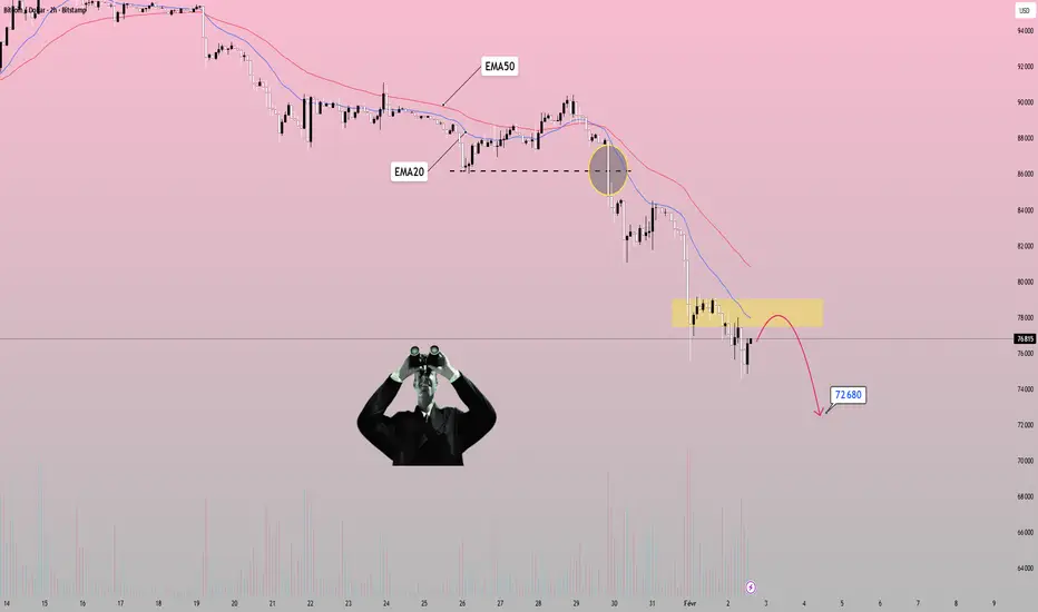 Si l'EMA20 n'est pas retrouvée, le risque d'étendre la baisse jusqu'à la zone des 72 680 existe toujours, ce qui est cohérent avec la structure bas haut-bas bas qui se forme.