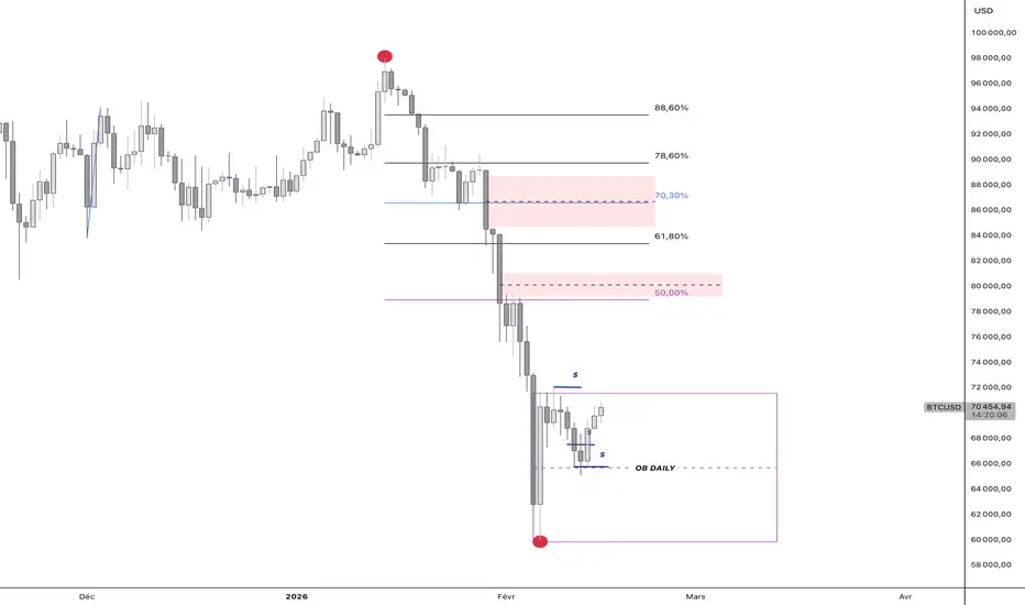 J'aimerais que le prix revienne dans les 50% de ma structure DAILY et le Fair Value Gap DAILY qui correspond environ au 78 900 - 80 100$ .