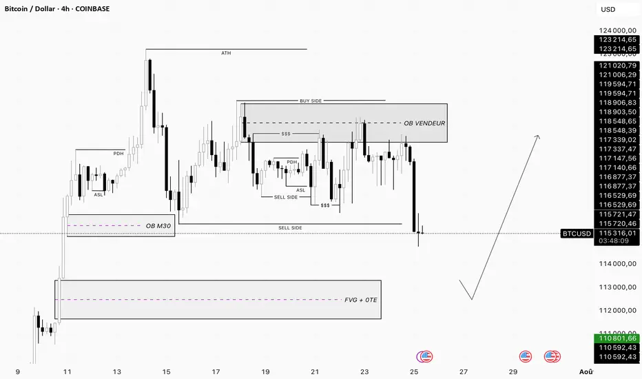 Nouvelle analyse sur le BTC. Ces derniers jours, le marché a parfaitement respecté les niveaux identifiés à l’avance. Le prix a consolidé sous une zone clé pendant plusieurs sessions, puis a fini par venir chercher la sell side autour des 115,750, confirmant ainsi notre lecture précédente.