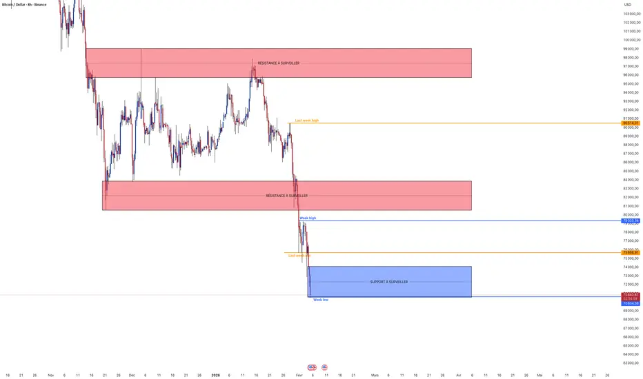 Analyse technique : Le Bitcoin traverse une tempête de deleveraging ce jeudi, s'enfonçant sous les 71,000 dans un climat de "peur extrême" (Indice Fear & Greed à 15). Comme vous l'avez noté, la structure de baisse est implacable. Ce n'est plus une simple correction, mais une véritable capitulation déclenchée par le repositionnement macro global. Les investisseurs fuient les actifs à risque face à un Dollar US (DXY) qui bombarde la zone des 98.000, dopé par la perspective d'une Fed dirigée par Kevin Warsh, bien plus rigoureuse sur la réduction du bilan.