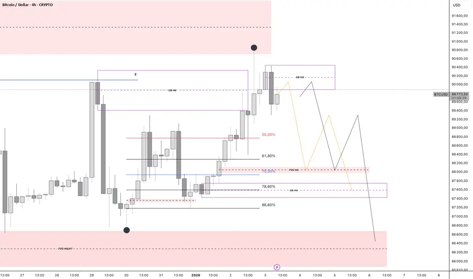 Je m'attends encore à un retracement baissier : jusqu'au 88 050 - 88 000$ qui correspond à un Fair Value Gap H4 et la zone OTE PATTERN entre les 70.3 - 78.6%.
