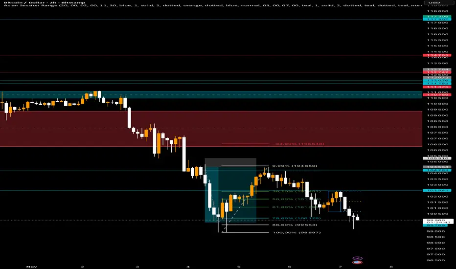 Bitcoin reste enfermé dans un canal de distribution baissière après le rejet violent de la supply zone 104.6 – 105.3k. Le prix teste actuellement le seuil psychologique des 100k, avec une compression typique avant une éventuelle cassure vers 98.8k. La dynamique reste clairement sous contrôle vendeur, avec des rebonds faibles et sans volume.
