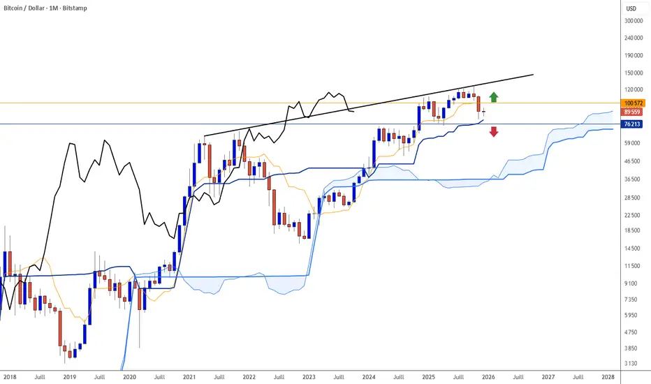 - haussier au-dessus de $100575 puis développement de la tendance sur cassure de la TL.