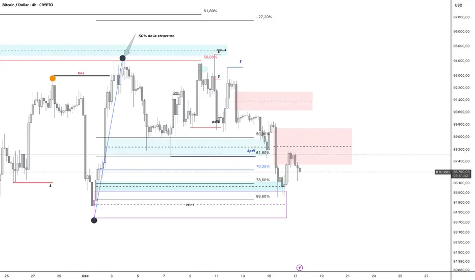 BITCOIN peut faire des points bas de plus en plus haut avec des légers retracement pour aller chercher la zone des 92 000$ qui correspondrait au Fair Value Gap H4.