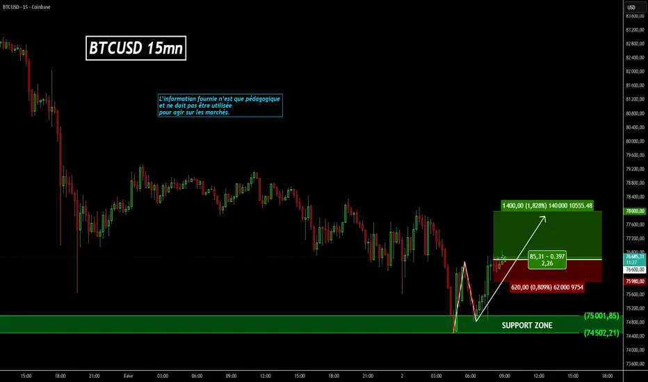 Le prix a parfaitement réagi sur la zone de support majeure identifiée entre 74 502$ et 75 001$. Le rebond en cours vise un retour rapide vers les 78K avec :