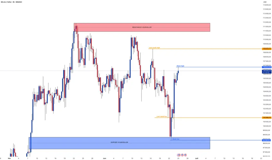 Pour cette journée il pourrait se faire rejeter à la baisse vers 104k mais on surveillera toute possibilité de continuation de la hausse vers 110k