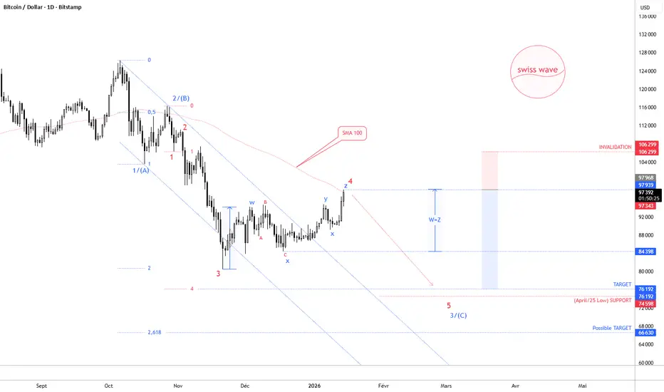 Nous venons d'ouvrir une position courte avec un ratio risque/rendement de 2,6, un objectif de 76 000 et un stop loss à 106 300. Comme vous pouvez le constater sur le graphique, la moyenne mobile simple à 100 a été atteinte et W=Z.