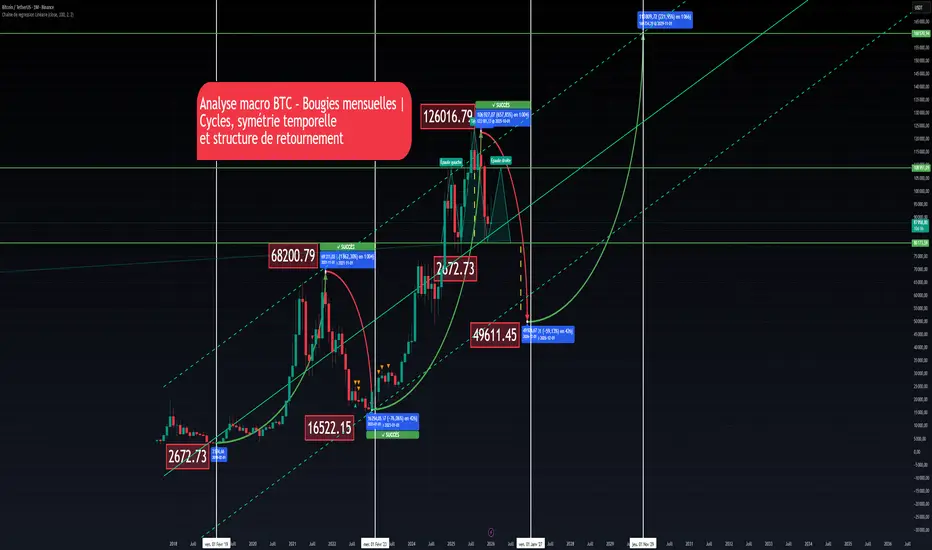 Analyse macro BTC – Bougies mensuelles | Cycles, symétrie temporelle et structure de retournement
