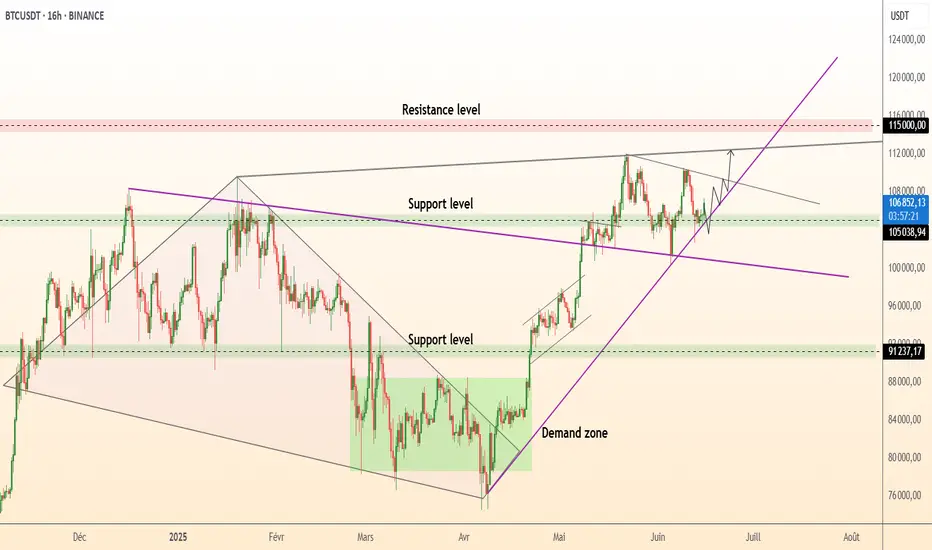 Acheter 105-106 k ; la rupture du drapeau au-dessus de 108 k vise 111,6 k → 115 k. Invalider sur une clôture en dessous de 101,8 k.