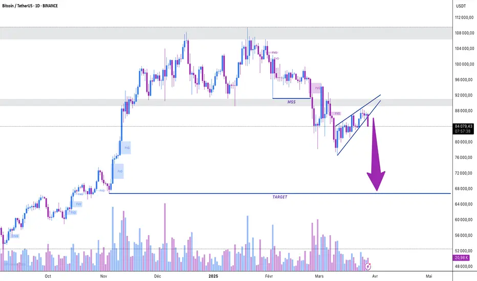Actuellement, le graphique du Bitcoin en Daily montre des signes de faiblesse après une forte hausse. Après avoir atteint un sommet, le prix a amorcé une phase de correction et a formé un patron de consolidation en biseau ascendant. Ce type de structure est souvent interprété comme un schéma de continuation baissière, indiquant un risque de correction plus profonde.
