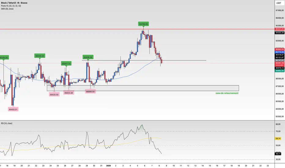 Tant que le prix ne casse pas les 86 806, le Bitcoin ne bascule pas officiellement en tendance baissière.