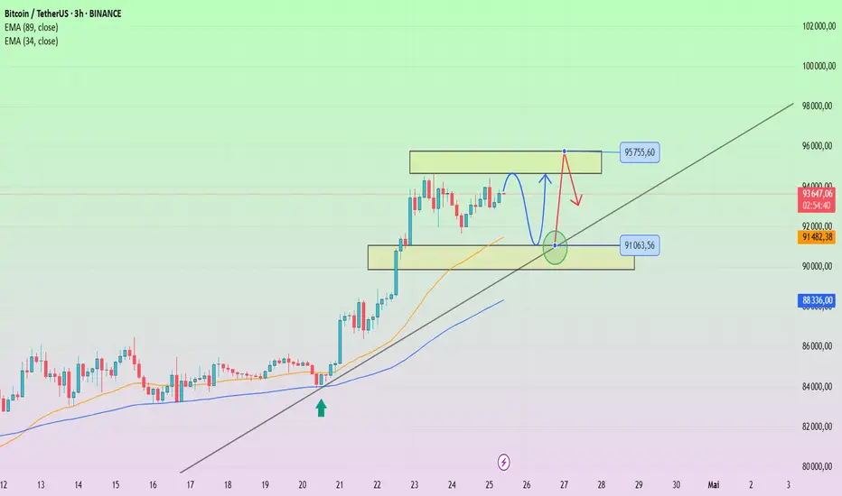 Actuellement, le BTC évolue au-dessus de sa ligne de tendance haussière, avec un soutien léger de l’EMA34 – une zone que l’on peut considérer comme “critique”. Si le BTC casse et clôture en dessous des 91 063, un scénario de correction plus profonde pourrait se matérialiser, ramenant les prix vers la zone des 88 000 – 89 000.