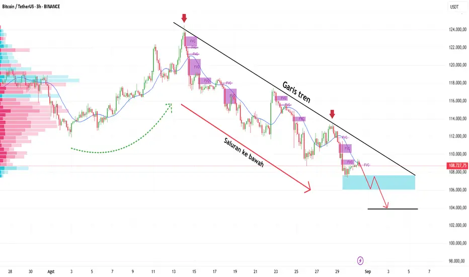 Grafik 3H menunjukkan saluran bearish yang jelas, dengan BTC berulang kali menolak zona resistensi 112 ribu dan saat ini berada di sekitar 108–109 ribu. EMA menurun, menunjukkan bahwa penjual masih menghadapi tekanan likuidasi. Selain itu, zona FVG yang tidak terisi menunjukkan bahwa dana jual belum melemah.