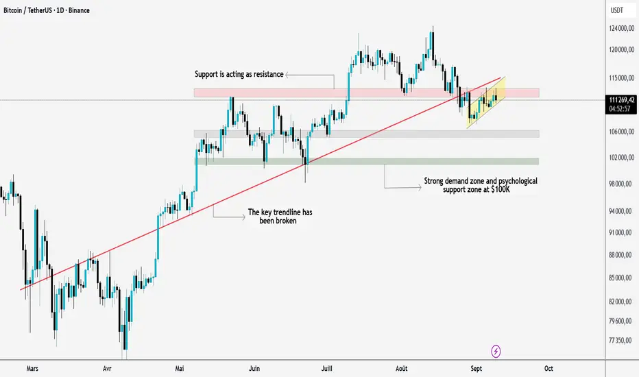 Le BTC vient de franchir une ligne de tendance clé, témoignant d'une faiblesse de sa dynamique. La zone qui servait autrefois de support est désormais devenue résistance, ce qui explique la difficulté du cours à progresser.