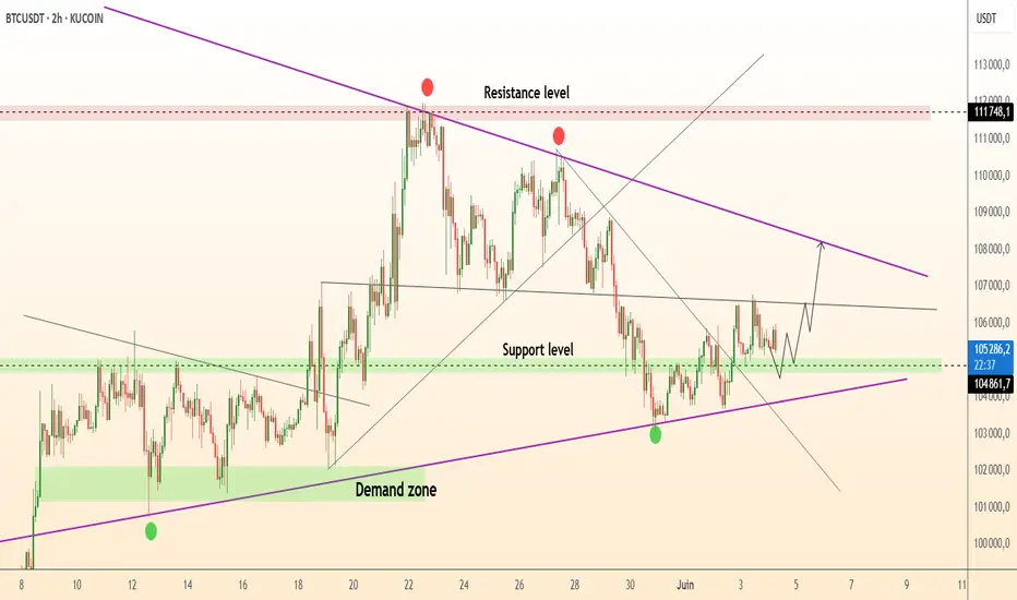 ● Le triple rebond à 104,8 k-105 k et la ligne de tendance violette ont créé de nouveaux plus bas plus élevés tout en maintenant le prix au-dessus du bloc de demande de mai.