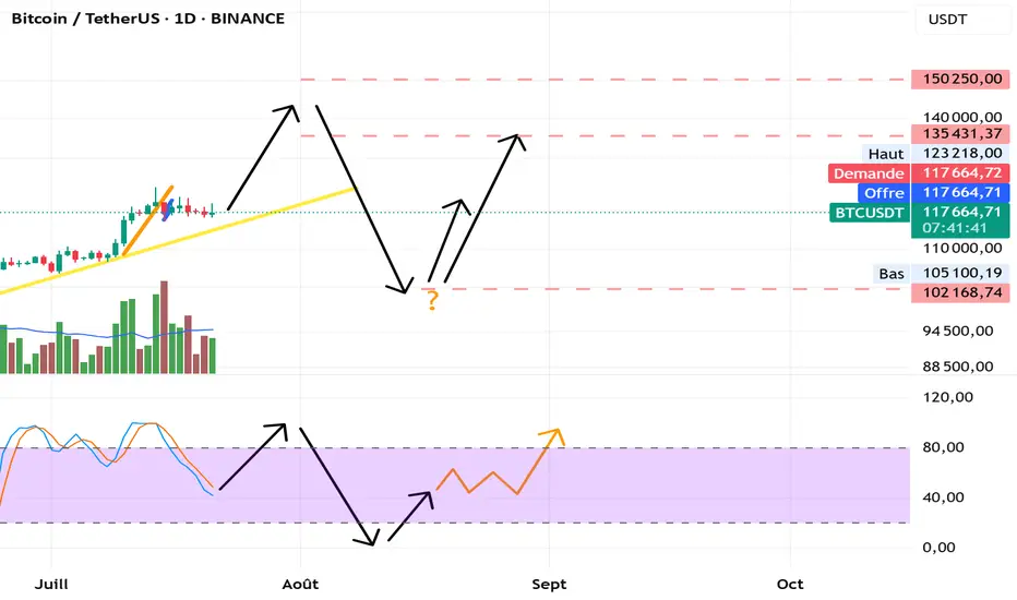 Dans un premier temps le Bitcoin devrait monter vers 135k-150k, avant une lourde chute vers 100k et ensuite une belle remontée vers les 200k (peut-être pour mi 2026).