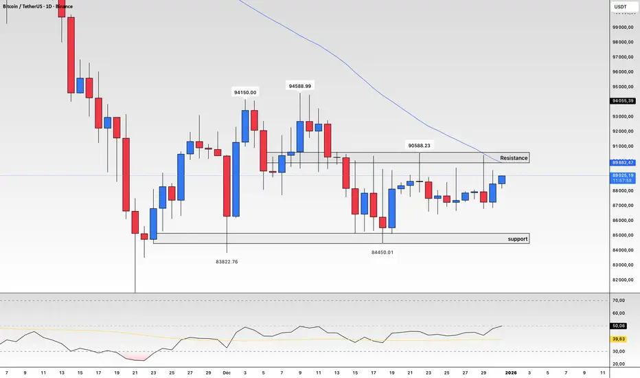 • soit à la hausse au-dessus des 90 588 $, ce qui validerait aussi une cassure du RSI 50 et de la moyenne mobile 50,