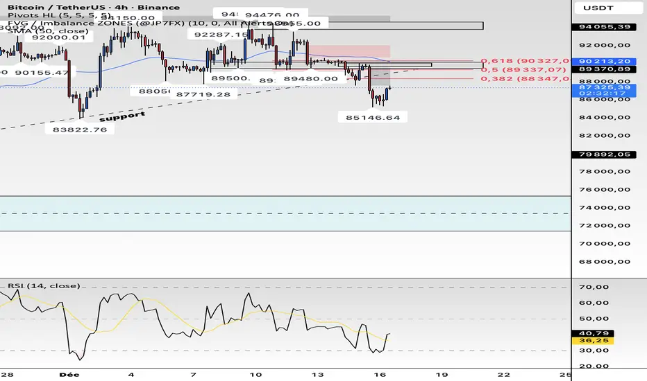 Comme anticipé, il a effectué un pullback propre avant de reprendre sa baisse, allant chercher les 85 146 $ — un mouvement parfaitement respecté par rapport à l’analyse d’hier.