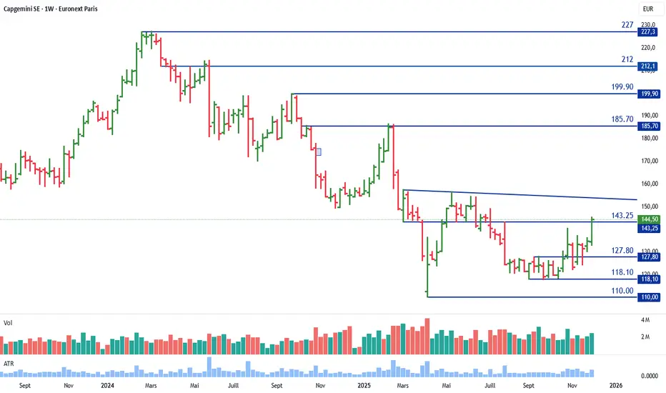 Capgemini (CAP) reprend des couleurs après plus d’un an et demi de baisse quasi continue. La tendance haussière n’est pas encore confirmée mais plusieurs signes encourageants avec la clôture au-dessus des 143.25 et du précédent haut, ainsi qu’un volume acheteur qui domine.
