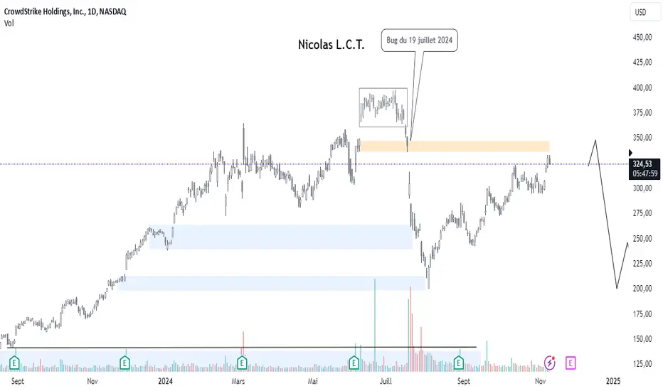 4 mois plus tard, le prix revient dans la zone du décrochage, et fort à parier que les 345 $ entraineront un repli, voire un retournement pour l'action de la société de sécurité.