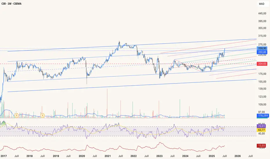 Cosumar qui maintient sa tendance haussière entamée depuis le début de l'année. Le titre a clôturé la semaine dernière au niveau d'une résistance importante et avec volume. Si le titre parvient à maintenir ce niveau, il pourrait se diriger vers les 280 voire 300 DH. Une consolidation n'est pas à écarter mais la tendance à long terme est très positive. La valeur offre un niveau de rendement très attractif (ce qui est très demandé au sein du marché marocain) et une dynamique positive grâce aux projets entamés dont la hausse de la production. L'entreprise devrait également profiter en 2025 d'une meilleure saison agricole du fait d'une meilleure pluviométrie.
