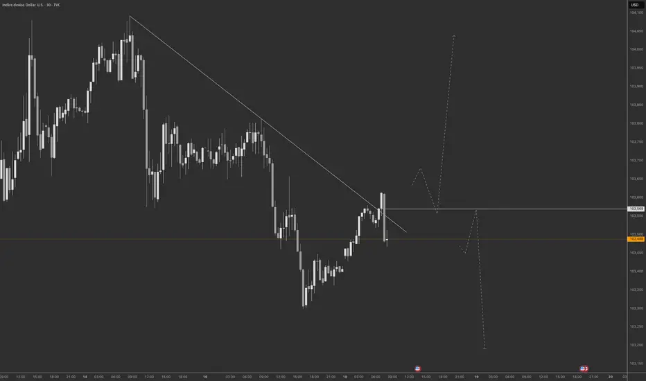L'analyse présente une étude de l'indice du dollar américain (DXY) sur un timeframe de 30 minutes, en utilisant l'indicateur Ichimoku et une ligne de tendance descendante.