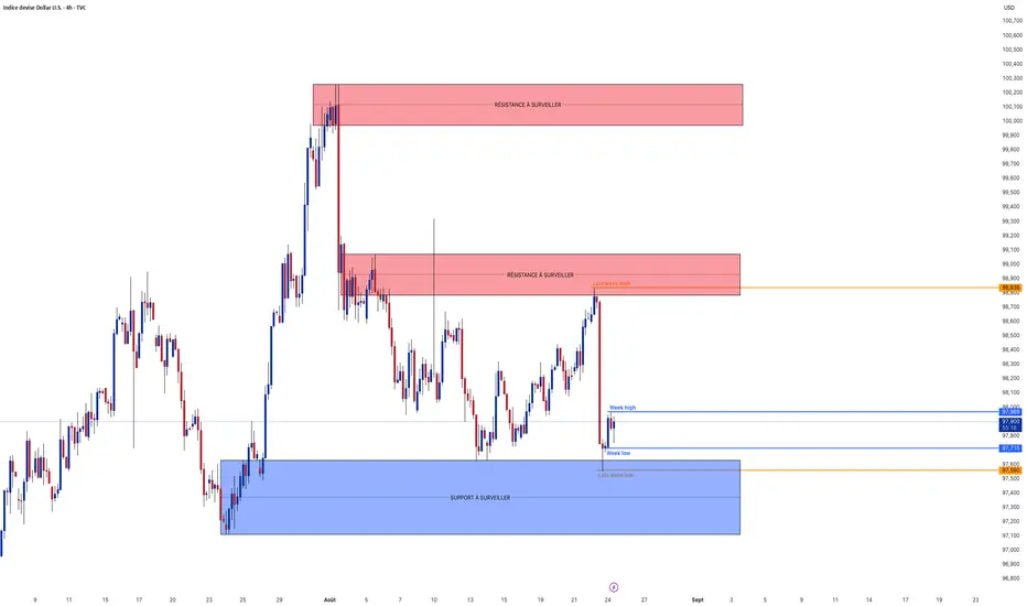 Analyse technique : Tant que l’indice reste rejeté sous la zone de résistance 98,85–99,10 (autour du “last week high”), le biais reste baissier vers 97,90 puis 97,60/97,00 (grand support bleu) ; à l’inverse, une clôture H4 au-dessus de 98,90–99,10 relancerait la hausse vers 99,60 puis 100,20 (résistance supérieure).