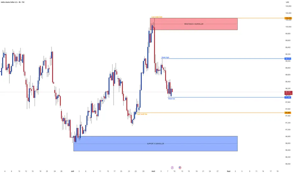 Analyse technique : Ce setup du DXY montre une consolidation sous pression vendeuse proche du creux weekly à 97.846, laissant entrevoir une reprise baissière vers le support des 97.497 voire 96.800 si ce niveau cède, tandis qu’un rebond au-dessus de 98.400 pourrait relancer un mouvement haussier en direction des 99.075.
