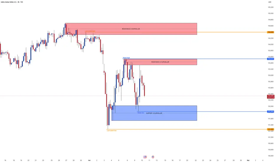 Analyse technique : Le dollar n’a pas vraiment bougé depuis hier. Il oscille entre 103.500 et 102.000