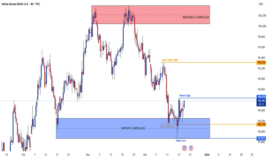 Analyse technique : Sur ce graphique de l'Indice Dollar US (DXY) en H8, le prix insiste lourdement sur le support critique de 98.138 (Last week low), montrant une incapacité des acheteurs à reprendre la main pour le moment.