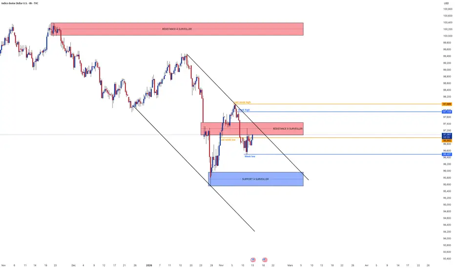 Analyse technique : Le Dollar Index perd tout son terrain gagné hier et retombe sous les 97.000 en ce vendredi matin. Le "rallye NFP" s'est essoufflé prématurément sur la supply zone des 97.400, prouvant que le marché reste structurellement baissier en attendant des preuves concrètes d'une inflation persistante. Cette réintégration sous les 97.000 est un signal de faiblesse majeur (Bearish Break of Structure interne). Tout se jouera à 14h30 : si les chiffres ne soutiennent pas le Dollar, le bas annuel à 96.350 sera le prochain arrêt immédiat.