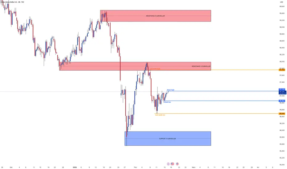 Analyse technique : La donne change sur le Dollar Index ce mardi matin. Le maintien au-dessus des 97.000 invalide la pression vendeuse immédiate que l'on observait en début de semaine. Cette réintégration suggère que le marché a fini de digérer les chiffres de l'inflation de vendredi et cherche maintenant à anticiper une résilience de l'économie américaine. La structure H8 passe de "Bearish" à "Consolidation Haussière". Si nous parvenons à briser la résistance des 97.25 avec une clôture solide, l'objectif se déplacera rapidement vers la zone de supply majeure des 97.75.